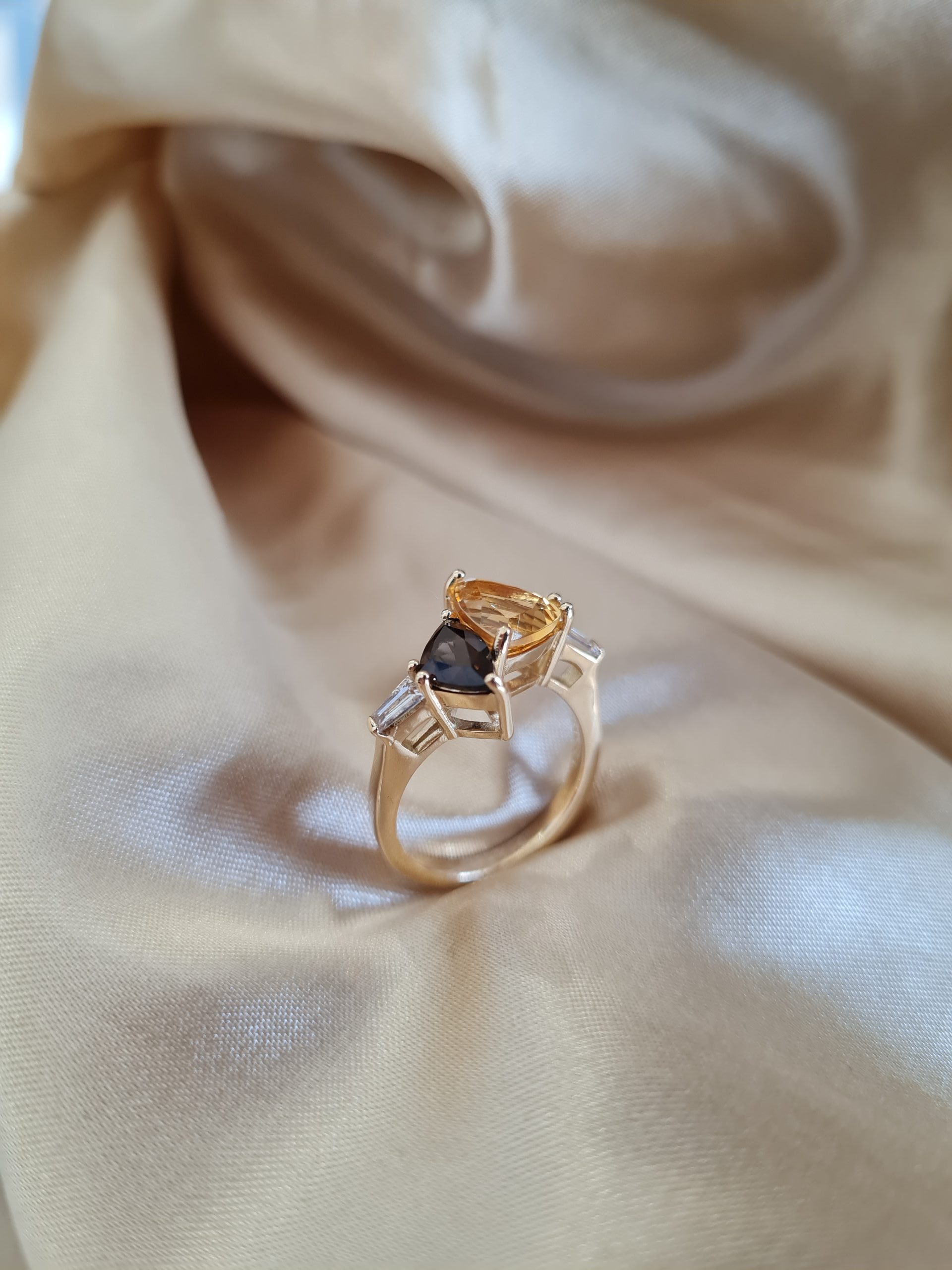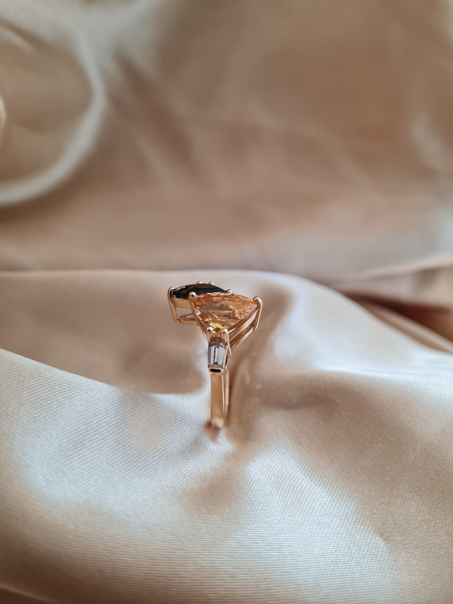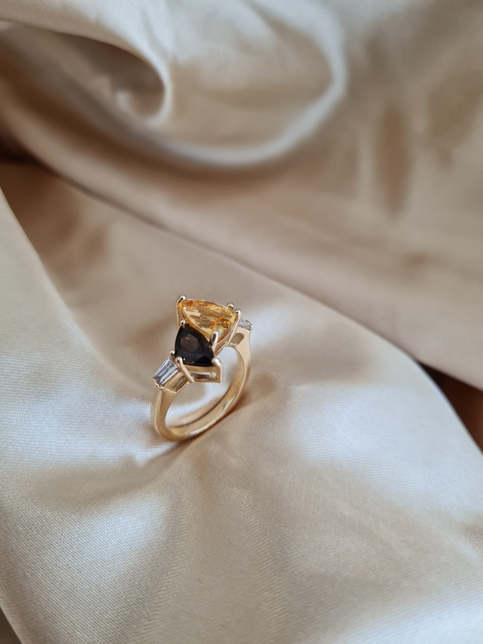 A one of a kind Moi et Toi design. This beautiful ring has two centre stones, the larger, an incredible golden Citrine and the second a Smokey Quartz. A tapered baguette is set on each shoulder creating an elegant flow from the centre gems to the highly polished gold band. This is an original design made up by our in house designer.