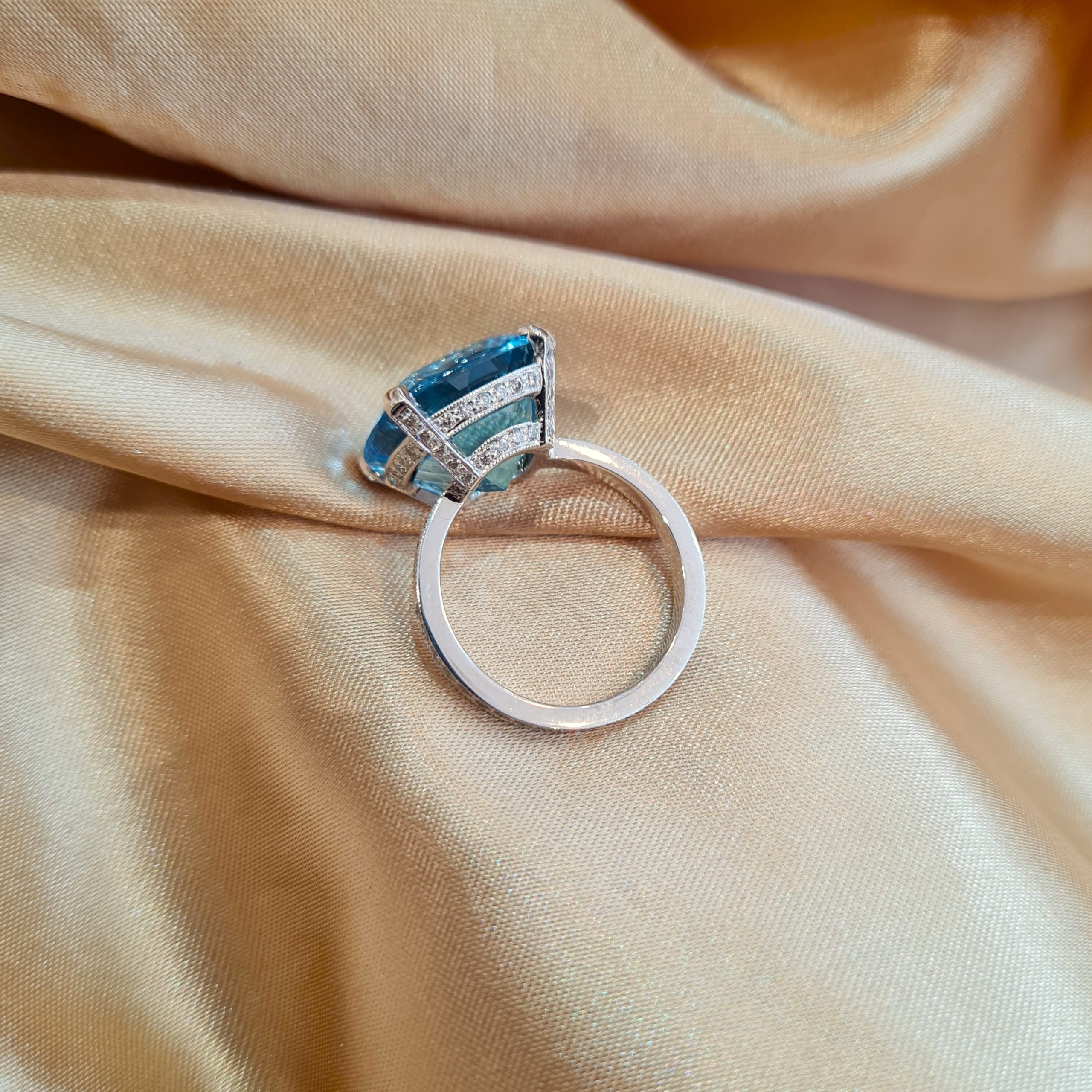 A four claw platinum ring set with a 9.50ct flawless aquamarine. The band is detailed with intricate milgrain and grain set with natural round brilliant diamonds. A total diamond weight of 1.80ct