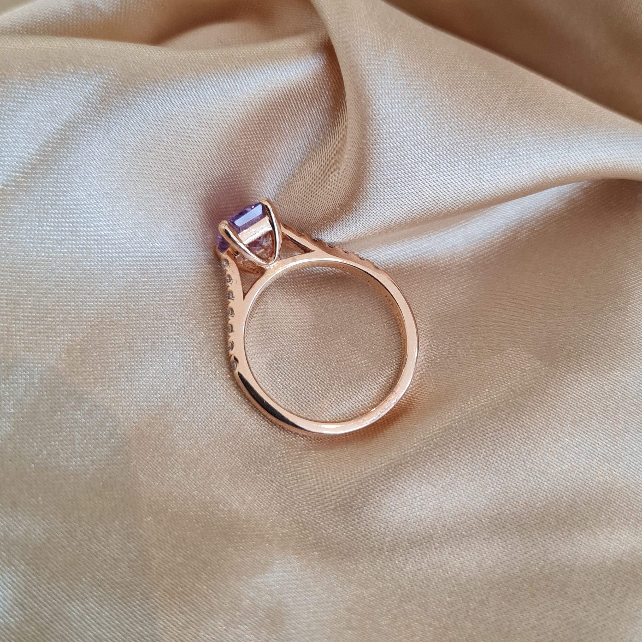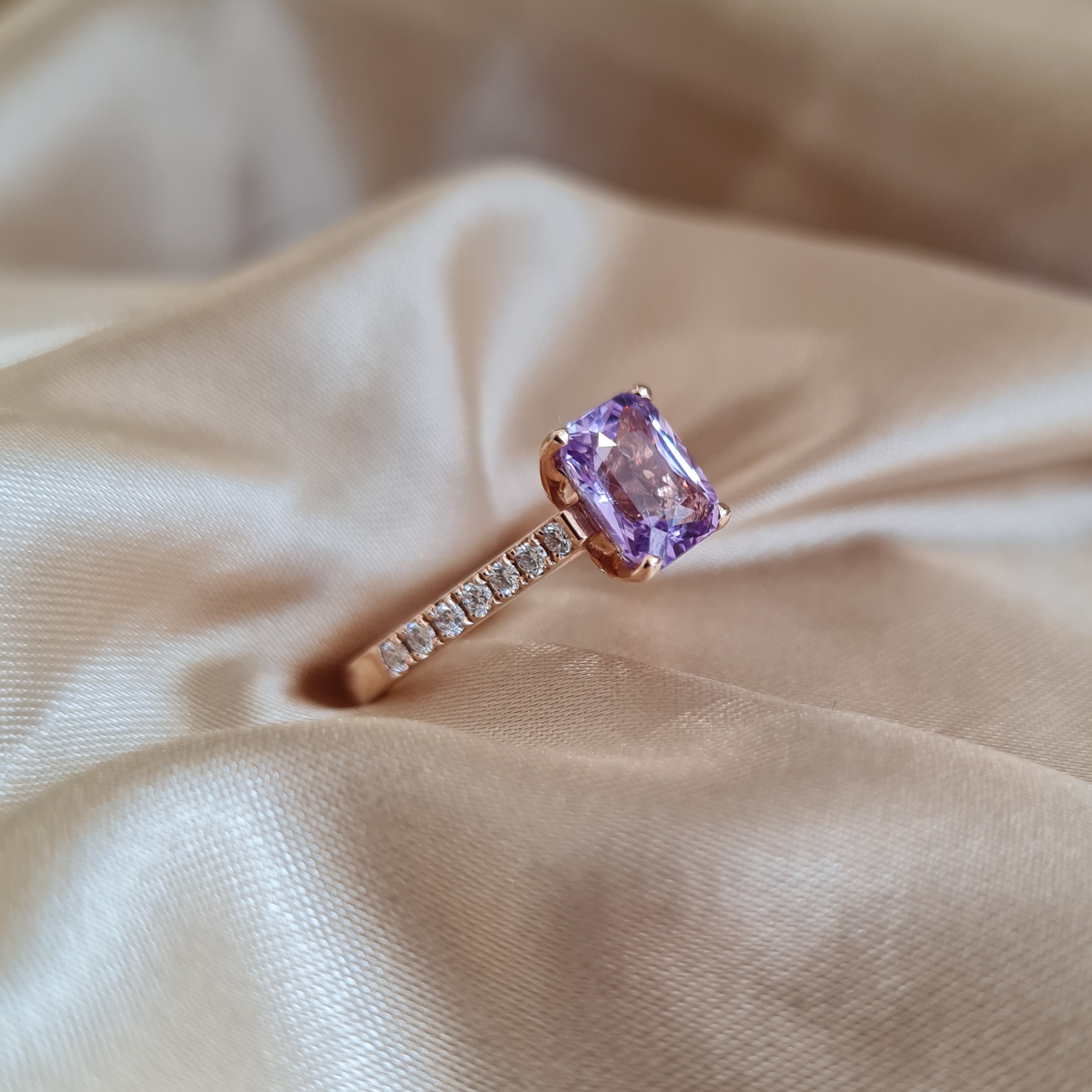 A 1.93ct radiant cut lilac sapphire is set in 18ct rose gold with additional round brilliant cut diamonds set either side of the centre sapphire. There is a total diamond weight of 0.22ct