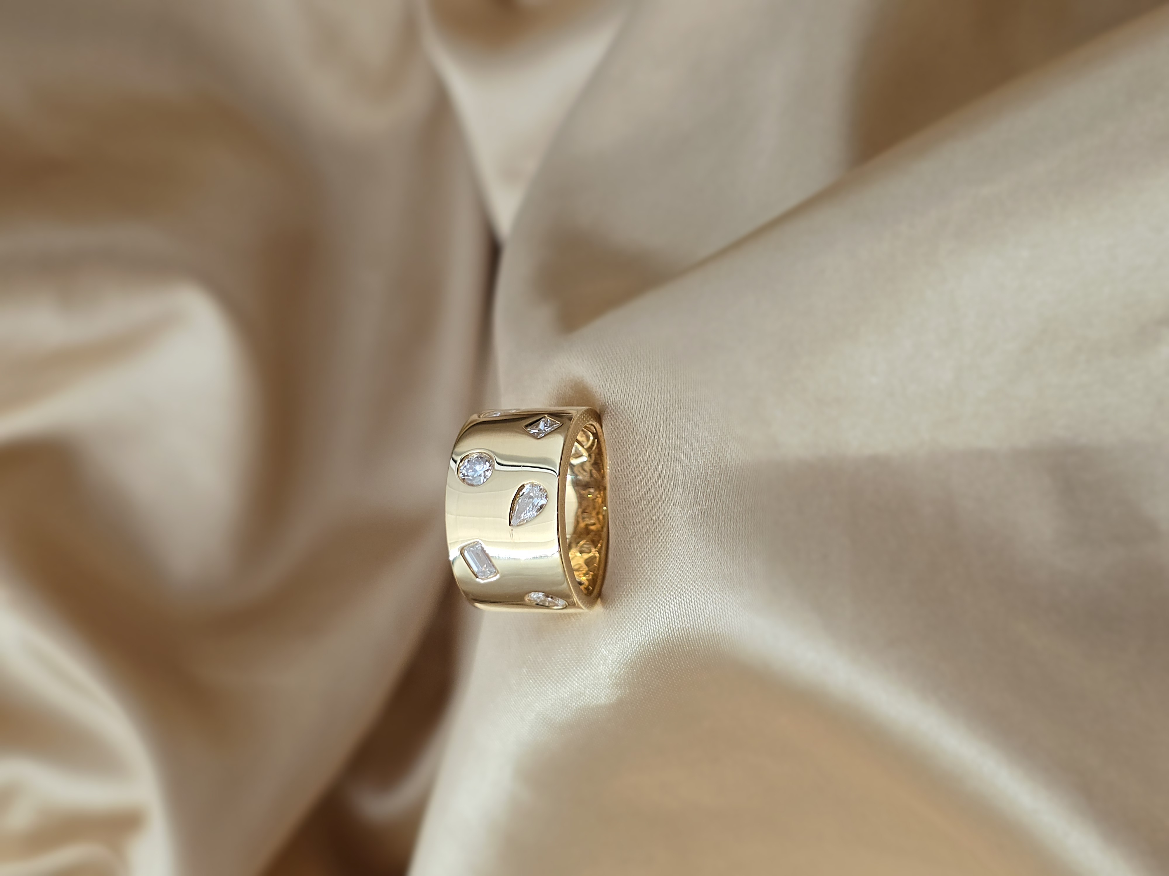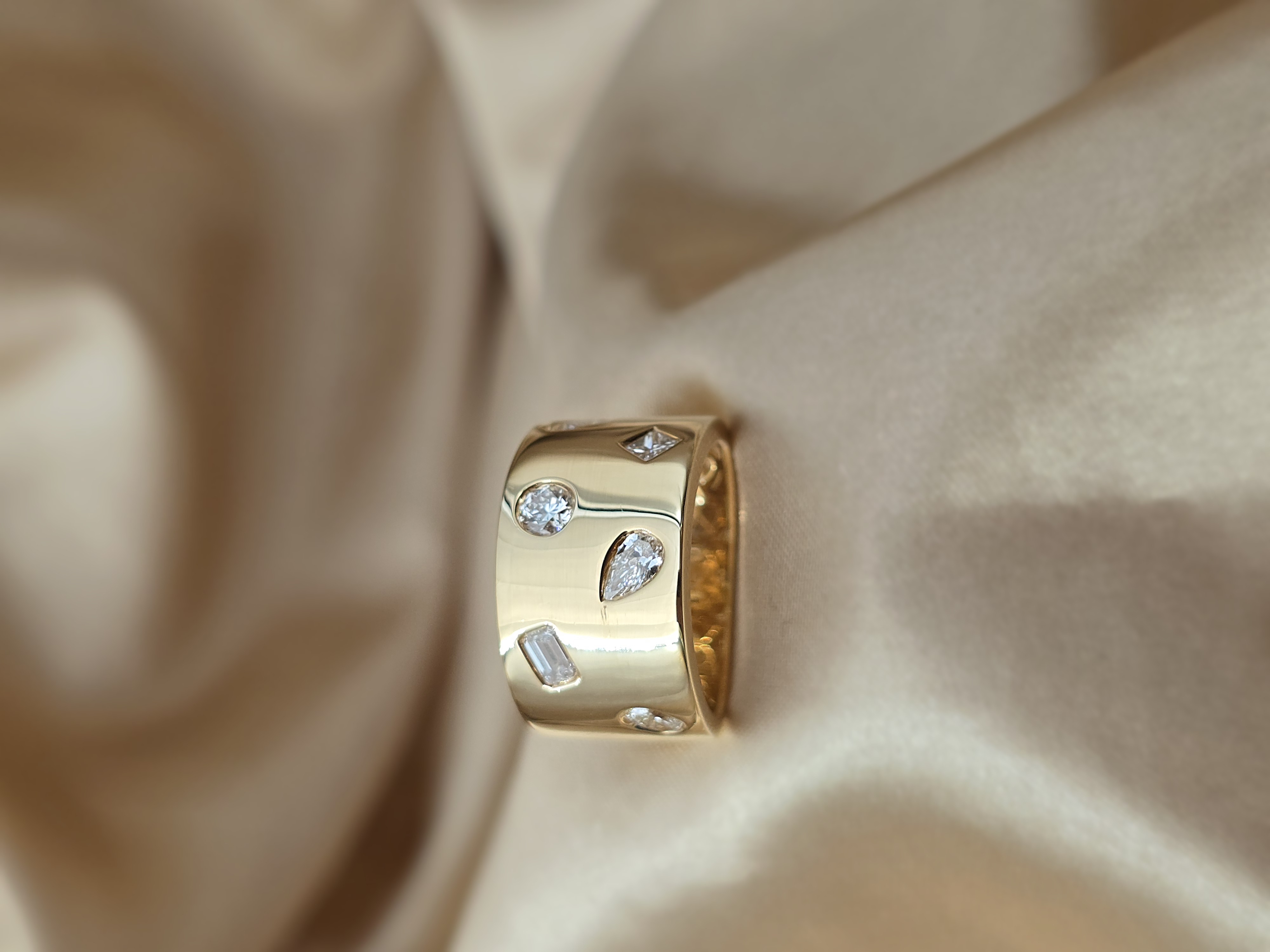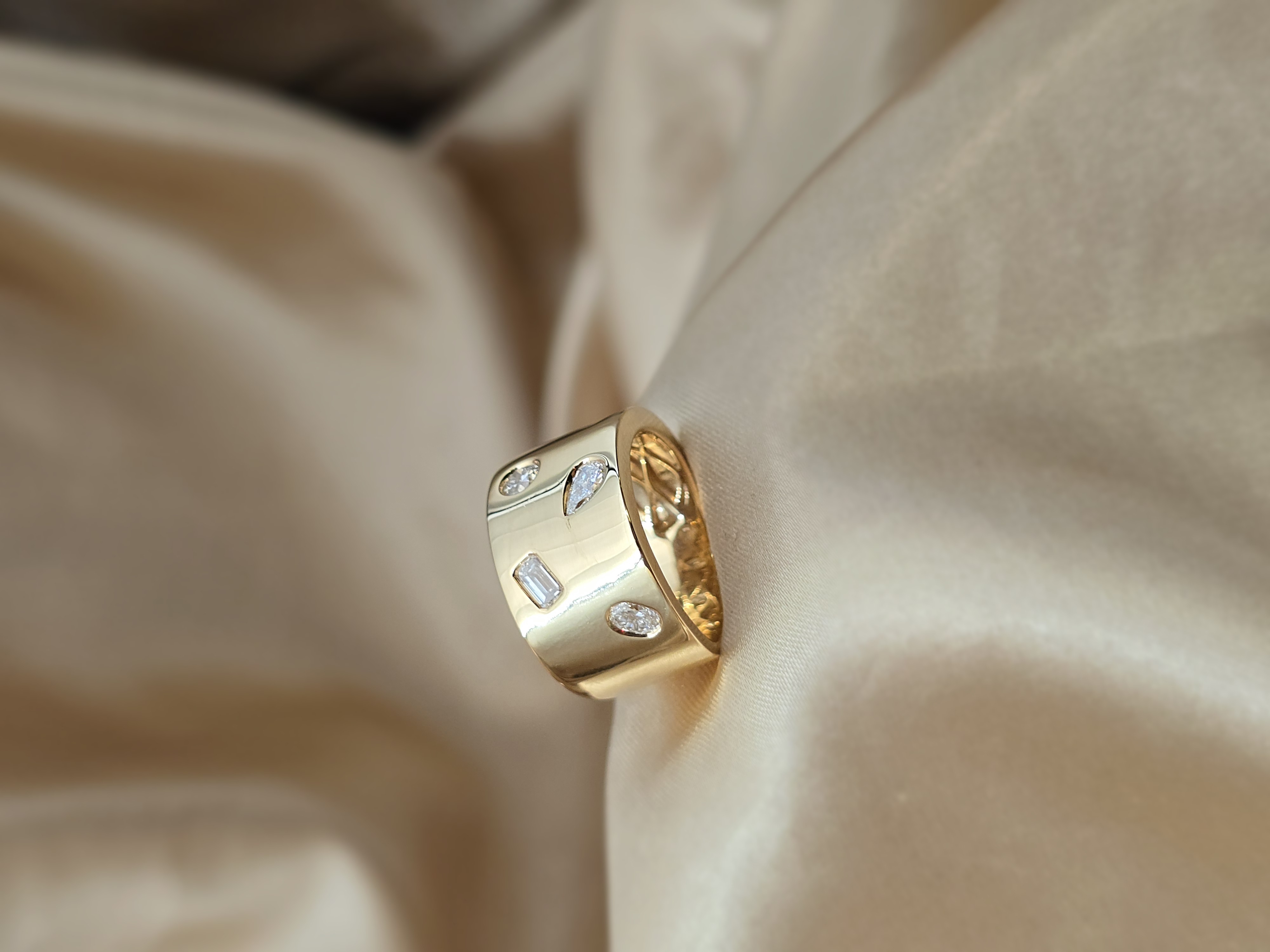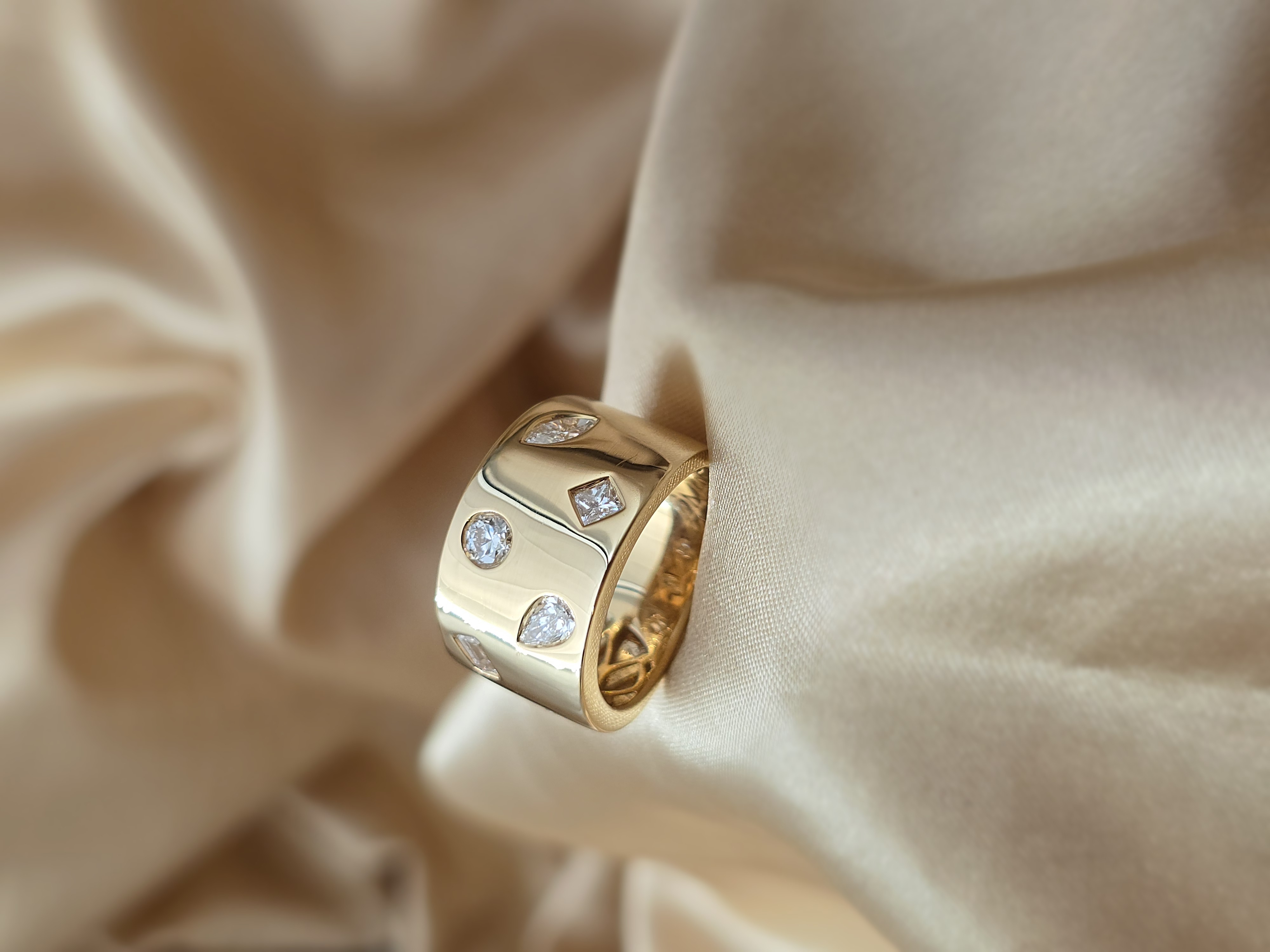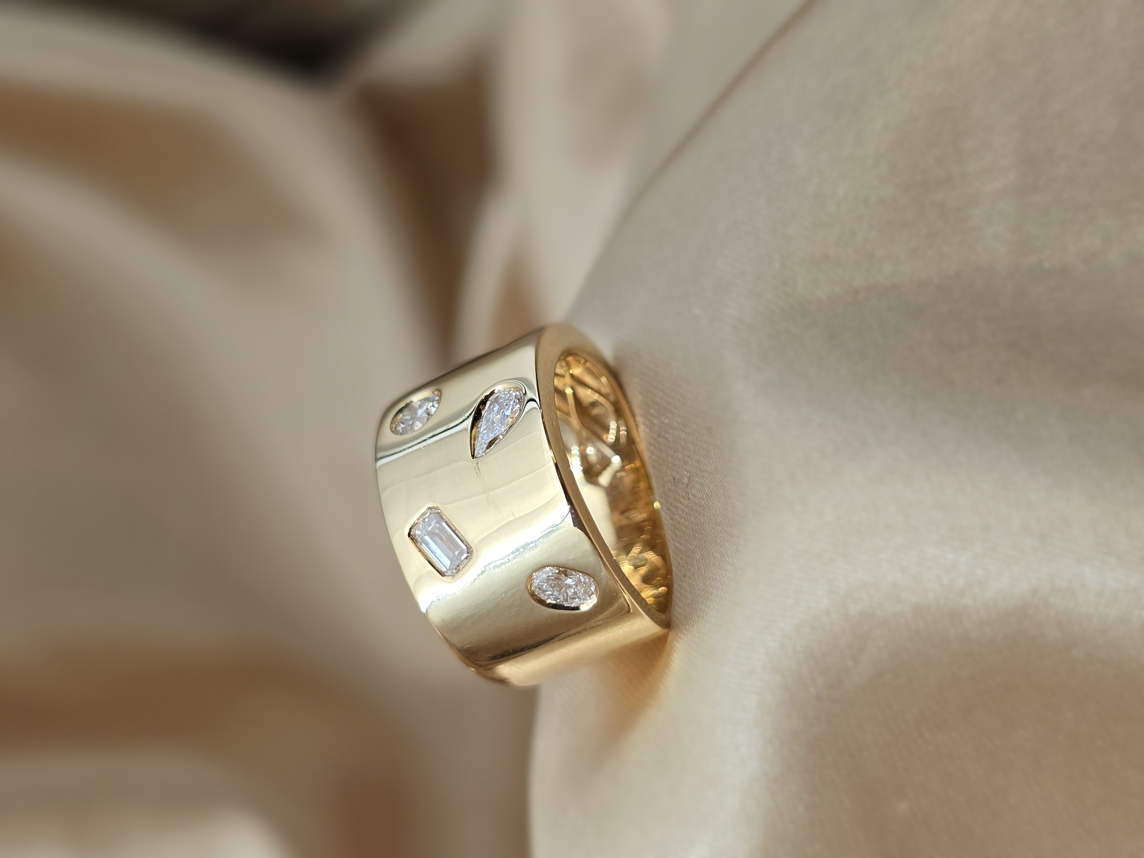 • Metal: Solid 18ct Yellow Gold • Diamonds: Natural mined diamonds (mixed shapes) • Total Diamond Weight: 1.12 carats • Diamond Cut Shapes: Round, pear, and princess-cut accents • Setting Style: Flush / bezel-inspired setting for a smooth, modern finish • Finish: High polish • Band Style: Wide gold band with sculpted diamond placements